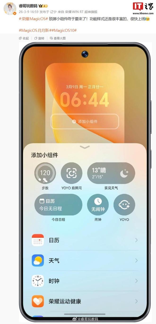 IT之家3月9日音书,博主@睿哥玩数码本日发文暴露,幸运飞艇app荣耀MagicOS系统将要更新守旧锁屏小组件功能。博主示意:“功能神色仍是很丰富的,很快上线。”