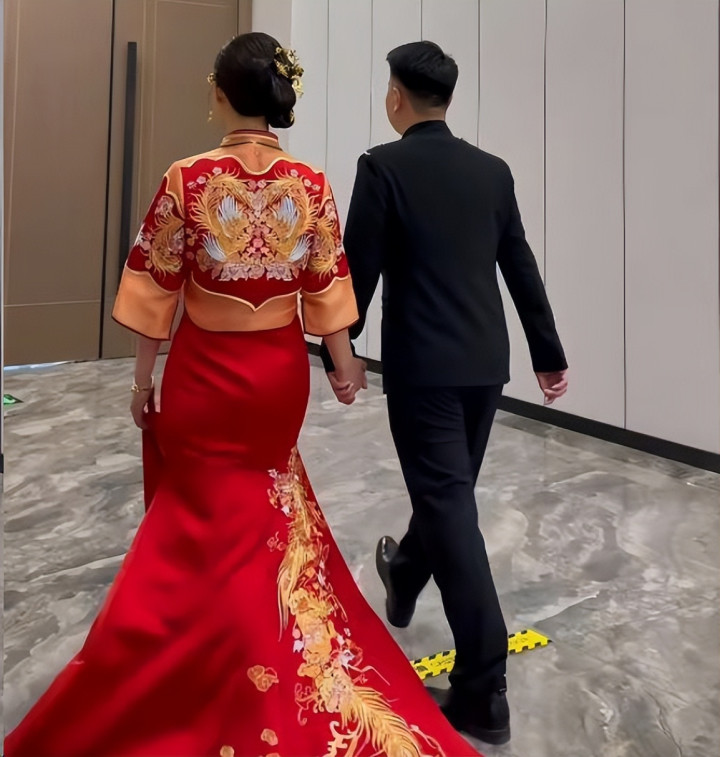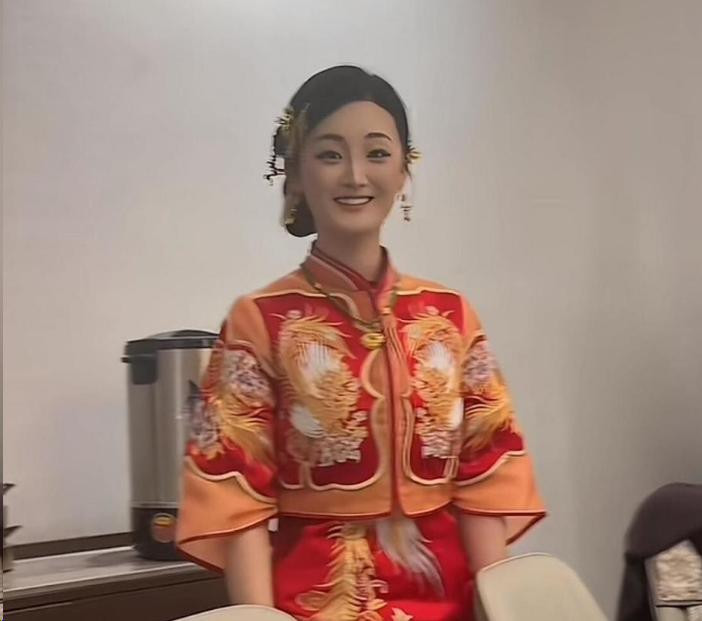 视频里的陈亚男,一稔孤立大红色的及第秀禾服,那叫一个喜庆。