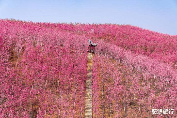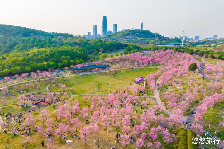 入园骨干说念,樱花拱廊如云似雾。山顶不雅景台,鸟瞰千亩樱海全景。