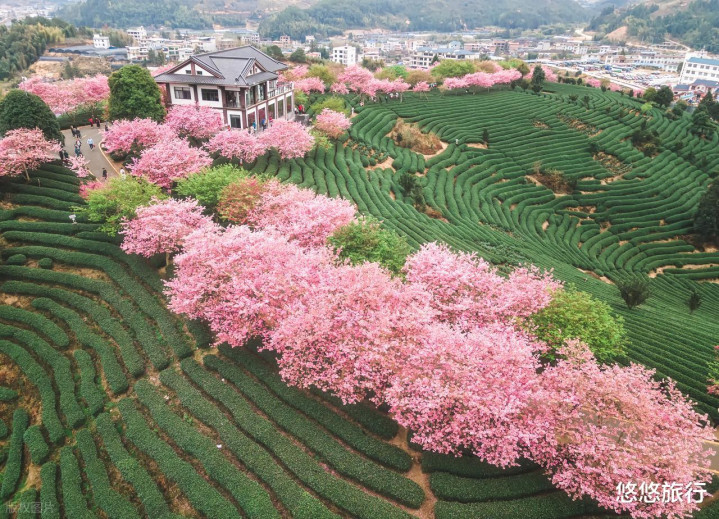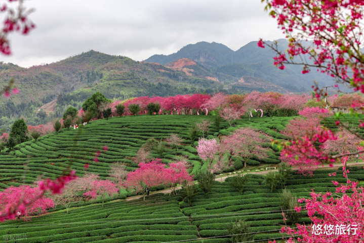 乘小火车穿越茶樱海,鸟瞰茶园全景 品香茗赏樱花。青山如黛,茶园如缎。