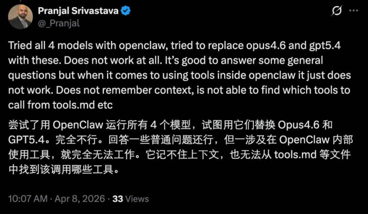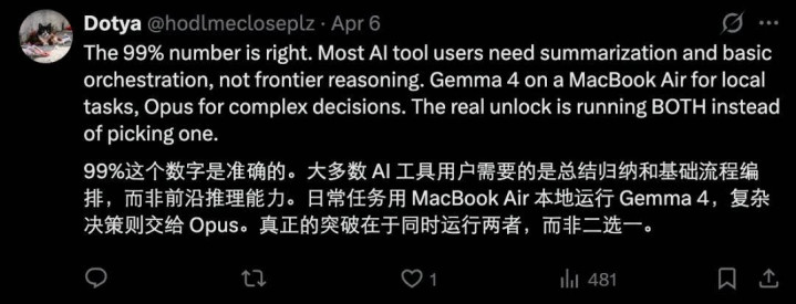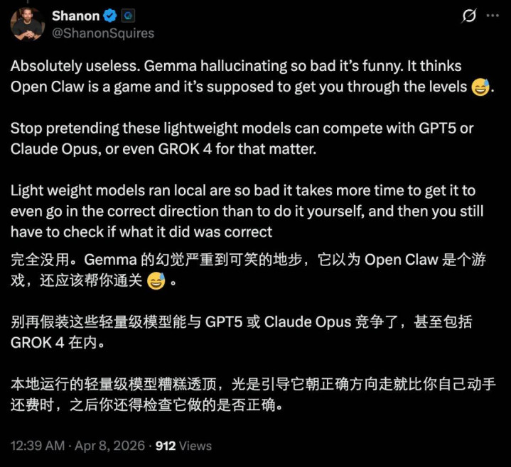 那跑起来限度怎样样呢?从反馈来看,即使是最大版块的 Gemma 4,才调水平上和 Opus 等顶尖模子详情还是差一大截,何况在调用用具、长荆棘文等方面短板显明。这让好多东说念主质疑腹地部署这一模子的实用性。