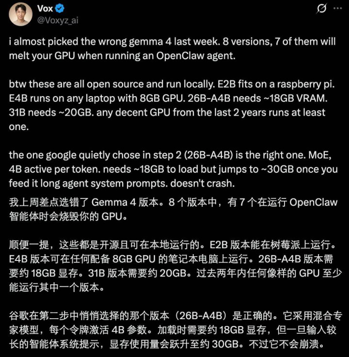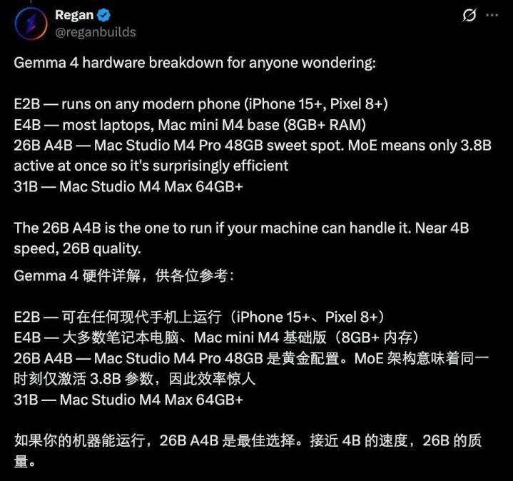 诚然,具体选哪个版块的 Gemma 4,还要看你电脑的建树情况,有东说念主给出了以下参考提倡,看来,要想运行官方推选的 26B A4B 版块,你得买一台 Mac Studio M4 Pro 48GB 或与之终点的机器。