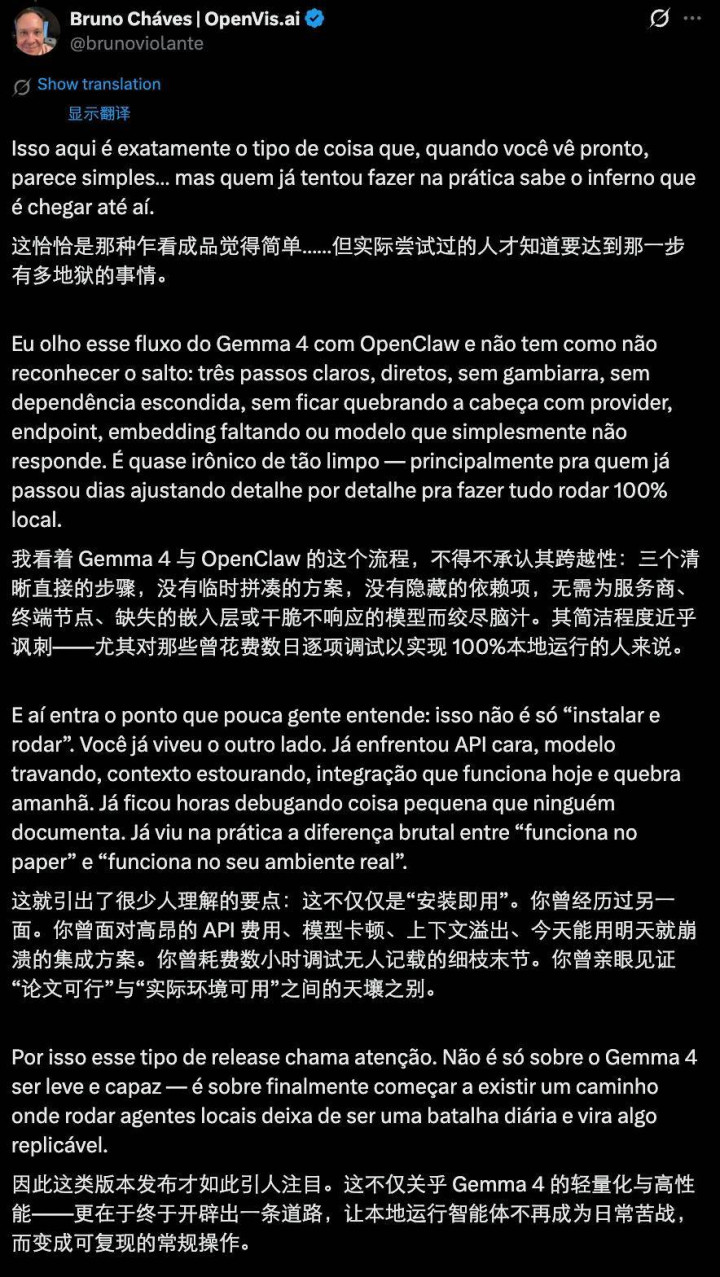 看了谷歌官方给的这个教程,有东说念主叹息地说:Gemma 4 + OpenClaw 的总计这个词进程超等干净,就三步,了了平直,莫得任何弯弯绕绕、荫藏依赖、provider 建树、endpoint 调欠亨、embedding 缺失、模子不反映这些破事。昔日作念腹地 Agent 的东说念主,闲居要花好几天调多样细节、debug 文档里根蒂不写的坑、濒临 API 贵、模子卡死、荆棘文爆炸、今天能跑未来就崩的问题。是以开云app在线体育官网此次发布着实历害的不是模子自身「轻量又强」,而是终于把「腹地跑 Agent」从一场每天皆在打的鏖战,形成了着实可复制、简单可用的东西。