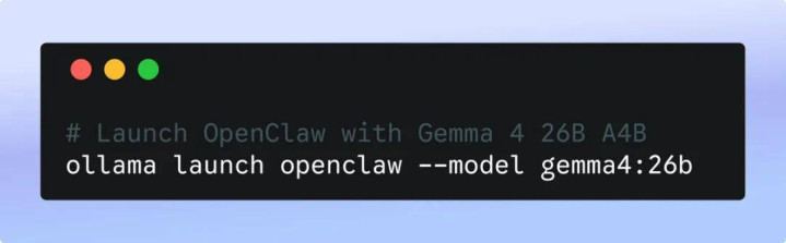 第三步:通过 Ollama 以 Gemma 4 为后端启动 OpenClaw。这将自动在你的系统上装配 OpenClaw 并使用 Gemma 4 26B A4B 启动它。
